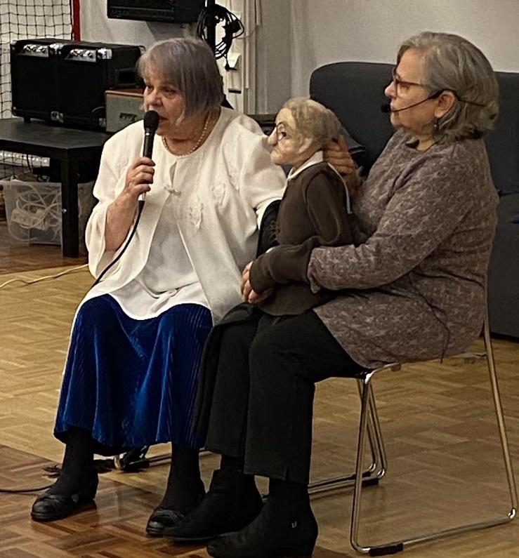 Hyvin hautunut puuro maistui niin kanelihunnulla kuin voisilmällä porukalle. Puurokuppien tyhjennyttyä lavalle astelivat vierailevat taiteilijat Taimi Siipilehto-Kuisma ja Soile Thun Keravan Lausujista sekä kaksi "puhuvaa" nukkea. Koskettavasta runosikermästä tunnistin ainakin Paavo Kajanderin ja Eeva Kilven tekstiä. Hauskaa ja erilaista lausuntaa! "Pohjalaisakaksi" tunnustautunut Soile Thun tarjosi meille "encorena" eli ylimääräisenä Ilpo Tiihosen runon "Sikojen rakkaus". Mikäs se paremmin sopikaan, kun kohta kinkunpaistoon ryhdytään.