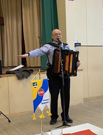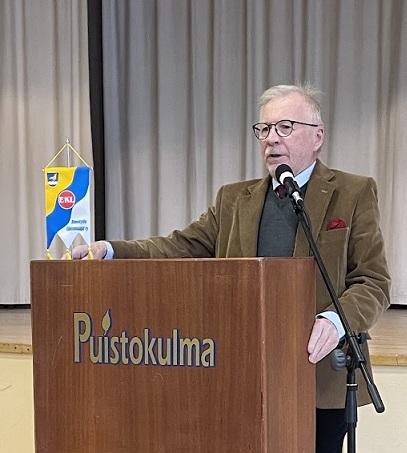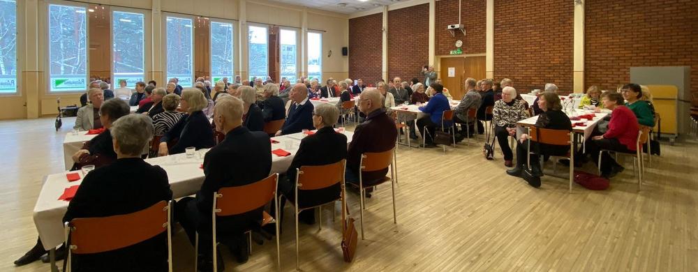 Lounaan jälkeen EKL:n Uudenmaan Piirin puheenjohtaja Markku J. Jääskeläinen otti puheet. Kylläpä on mukavaa kuunnella juhlapuhetta, joka on rento ja hauska, mutta täyttä asiaa. Mikäs ihme se, kun Markku on hakenut oppia Amerikasta asti. Puhe sivusi viimeisintä, vuoden 2025 "Huomisen kynnyksellä" -tutkimusta, joka toteaa suomalaisen yhteiskunnan sisältävän paljon ikään perustuvaa syrjintää. Siitähän meillä on kokemusta, jokaisella yksilönä ja myös eläkeläisjärjestönä.