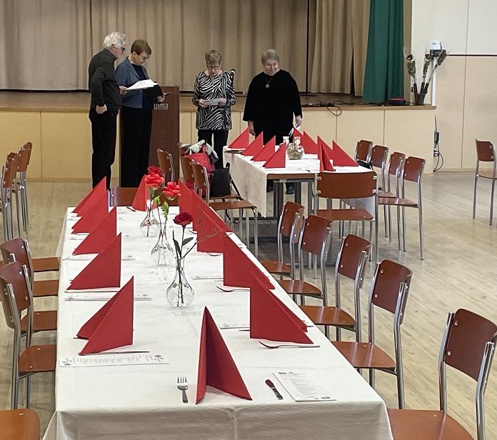 Yhdistyksen tosiveteraani eli jo 30 vuotta mukana viihtyneet ja yli 90-vuotiaat Maire Forssten, Seija Puhakka ja Veli Roivainen kukitettiin uljaalla, syvän punaisella ruusulla. Veli oli ollut silmäoperaatiossa juuri juhlan alla, mutta onneksi tytär Tuija toimitti veteraaniruusun silmäänsä kotona suojelleelle Velille.